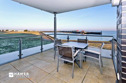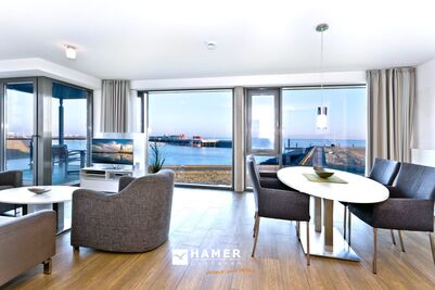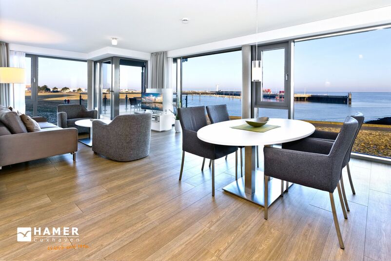 Totaler Seeblick. Direkt an der Sehenswürdigkeit "Alte Liebe" erleben Sie einen der schönsten Ausblicke Cuxhavens. Schöne 3 Zi. Luxus-Wohnung über 85m², 1. Etage, großes Wohnzimmer mit dem Panoramablick und Balkon (nord/west), vollständig ausgestattete Küchenzeile, 2 Schlafzi. mit Doppelbetten und Außenjalousien, 2xTV, DVD, Radio/CD, kostenloses W-Lan-Internet, 1xDu/WC, 1x Gäste-WC, reservierter Außenstellplatz, freie Saunanutzung, Nichtraucher, keine Haustiere.