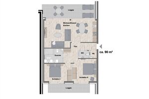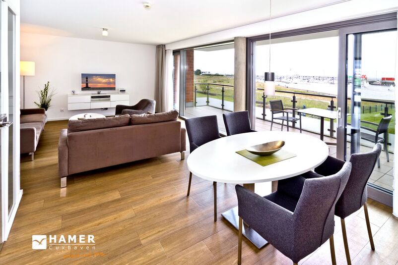 Seesicht vom Feinsten. Komfortable 3 Zi. Luxus-Wohnung über 91m², 1. Etage, großzügiges Wohnzimmer mit großem Balkon (nord), ein weiterer Balkon zur Südseite an den Schlafzimmern, vollständig ausgestattete Küchenzeile, 2 Schlafzimmer mit Doppelbetten und Außenjalousien, 2xTV, DVD, Radio/CD, kostenloses W-Lan-Internet, 1xDu/WC, 1x Gäste-WC, reservierter Außenstellplatz, freie Saunanutzung, Nichtraucher, keine Haustiere.