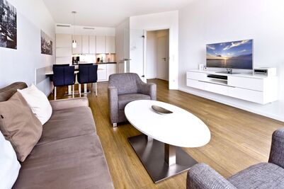 Blick auf die "Alte Liebe"! Schöne 2-Raum-Wohnung in der 2.Etage mit großem Balkon (ost). Die vollständige Küchenzeile mit Mikro, Back., Geschirrsp. etc. garantiert höchsten Komfort. 3D-SAT-TV, Blue-Ray-DVD, Kompaktanlage, kostenloses W-Lan-Internet, separates Schlafzimmer mit Außenjalousien und hochwertigem Doppelbett, allergikerfreundlich, ebenerdige Dusche/WC, Föhn, freie Saunanutzung, breiter Tiefgaragenstellplatz, keine Haustiere und natürlich Nichtraucher.