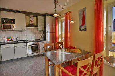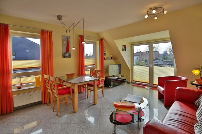 Sehr schöne, helle 3-Raum-Maisonette-Wohnung auf ca. 60m², 1.Etage, 1 Schlafzimmer mit Doppelb., 1 Schlafzimmer im Dachgeschoss mit 2 Einzelbetten und TV, separates WC mit Waschbecken, Wohnzimmer mit Küchenzeile (Backofen, Mikrowelle, Geschirrspüler, Gefrierfach) Kabel-TV/Stereo, kostenloses W-LAN Internet, teilweise Insektenschutz an den Fenstern, Dusche/WC, großer Balkon (süd) mit Markise. Die Wohnung ist komplett gefliest, keine Haustiere, Nichtraucher!