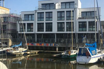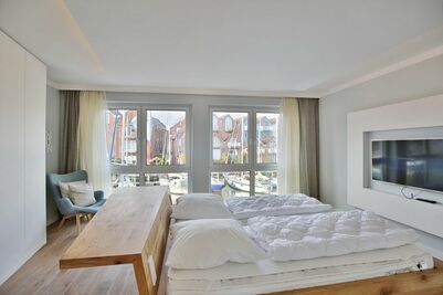 Purer Luxus für bis zu 6 Pers. auf 4 Etagen. Großer Wohnbereich mit offener Designerküche (Backofen, Geschirrspüler etc.), TV, Terrasse (west) direkt in der Marina, Gäste/WC, Flur/Garderobe. 1. Etage: Großes Schlafzimmer mit Doppelbett, TV, Bad en Suite (Du/WC) & Ostbalkon. 2. Etage: Ein Schlafzimmer (Doppelbett) & TV, 1 Schlafzimmer (Etagenbett, oben 0,80m x 2,00m, unten 1,40 x 2,00), Dusche/WC (mit Waschmaschine & Trockner). 3. Etage: Wohnbereich in der Lounge mit großer Dachterrasse (west). Blick in die Marina aus allen Räumen, Lichtkonzept mit integrierter Beleuchtung, TV (Antennenempfang, nur öffentlich-rechtliche-Sender), Lautsprecher in den Wänden, kostenfreies W-Lan-Internet, Fahrradschuppen, 1 PKW-Stellplatz am Haus, Nichtraucher, keine Haustiere.