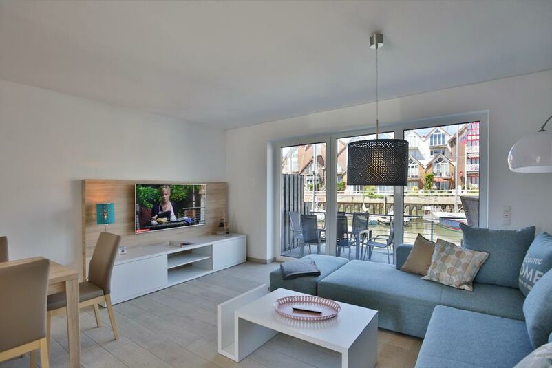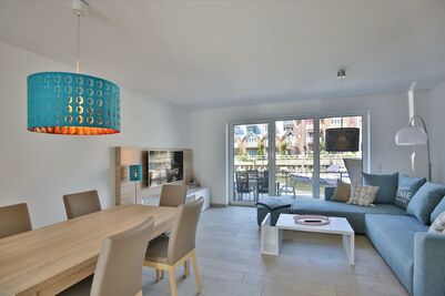 Neubauluxus für bis zu 6 Pers. auf 4 Etagen. Großes Wohnzimmer mit offener Küchenzeile (Backofen, Geschirrspüler etc.), große Terrasse (west) mit Blick in die Marina, Gäste/WC. 1. Etage: Großes Schlafzimmer mit Doppelbett mit TV, Du/WC mit Sauna & 1 Balkon (ost). 2. Etage: Ein Schlafzimmer (Doppelbett) & TV, 1 Schlafzimmer mit Etagenbett (oben 0,80m x 2,00m, unten 1,40 x 2,00) & TV, Badewanne/Dusche/WC. 3. Etage: Lounge mit großer Dachterrasse (west) und kleiner Küchenzeile. Kostenfreies W-Lan-Internet, Waschmaschine/Trockner, Bügeleisen/-Brett, Fahrradschuppen (eBike Lademöglichkeit), 1 PKW-Stellplatz am Haus, keine Haustiere gestattet, Nichtraucher.