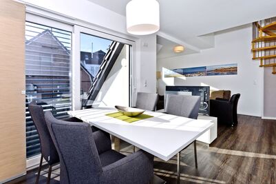 Sehr schöne, moderne 3-Raum-Wohnung bis 4 Pers über zwei Etagen (67m²), 2.Etage, 2 Schlafzimmer mit Doppelbetten, Wohnzimmer mit großer Küchenzeile (Back., Mikrow., Geschirrspüler), 2x Du/WC, 2xSAT-TV, Blue-Ray, CD-Radio, W-LAN kostenlos, großer Westbalkon mit Balkonmöbeln und Sonnenschirm (saisonabhängig), reservierter Pkw-Stellplatz vor dem Haus, keine Haustiere erlaubt, Nichtraucher.