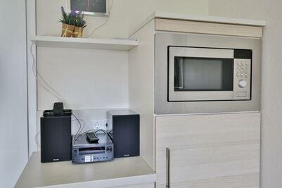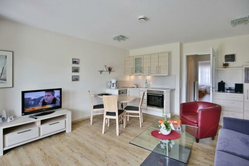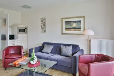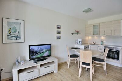 Schöne, helle 2-Raum-Wohnung auf ca. 47m² bis 2 Pers., parterre mit großer Terrasse mit Strandkorb und Rasenanteil (süd), 1 Schlafzimmer mit Doppelbett, Wohn-/Schlafzimmer mit Schlafcouch, 2xSAT-TV, W-LAN kostenlos, vollständige Küchenzeile mit Geschirrspüler, Mikrowelle, Backofen, Gefrierfach, Dusche/Wc, alle Räume mit Rollladen, Nichtraucher, Pkw-Stellplatz #2, keine Haustiere gestattet.