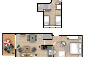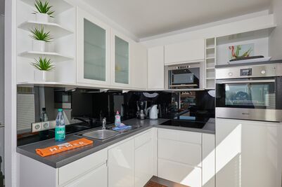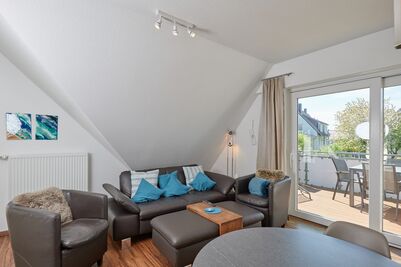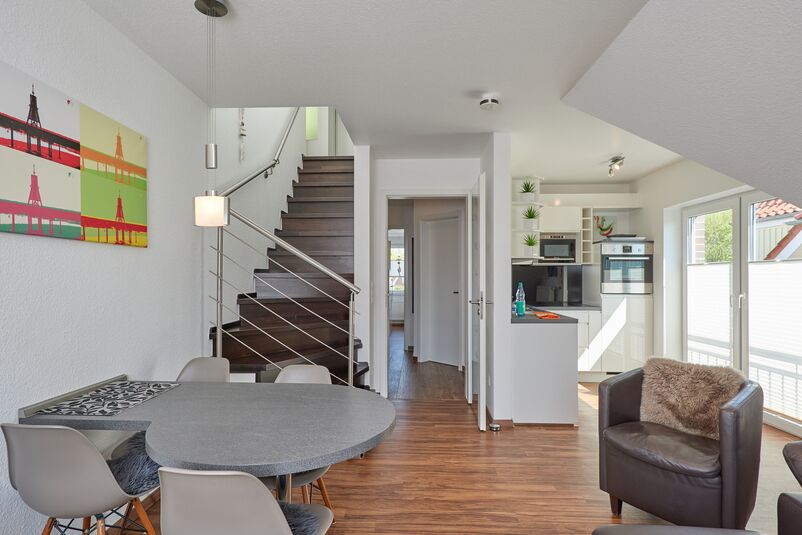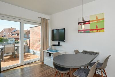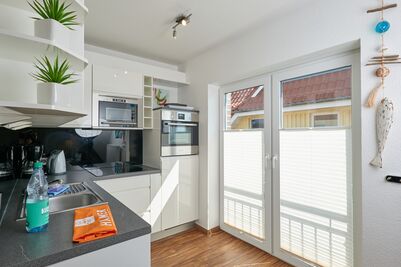 Sehr schöne, helle 3-Raum-Maisonette-Wohnung (57m²) bis 4 Pers., 1.Etage, 1 Schlafzimmer mit Doppelb., 1 Schlafzimmer im Dachgeschoss mit Einzelbetten, 2xDu/Wc, Wohnzimmer mit vollständiger Küchenzeile (Back., Mikrow., Senseo, Geschirrspüler) 3xSAT-TV,DVD-Player, Stereo, W-LAN kostenlos, großer Balkon (süd), Rollläden & teilweise Insektenschutzgitter, Pkw-Stellplatz #5, keine Haustiere erlaubt, Nichtraucher.