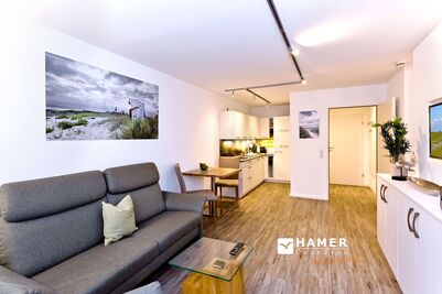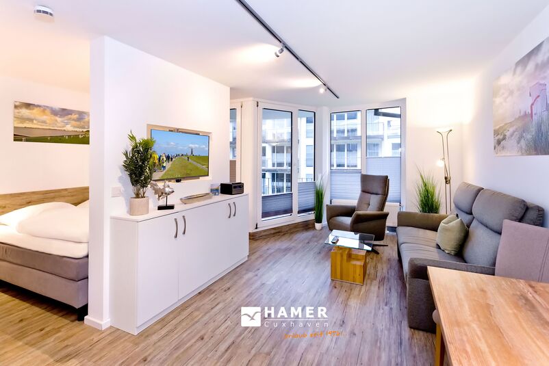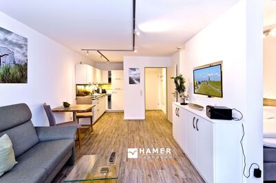 Schönes 1-Raum-Appartement für 2 Personen. Vollständige Küchenzeile mit Mikrow., Geschirrspüler etc., SAT-TV (drehbar), Sonoro-Kompaktanlage, kostenloses W-Lan, Dusche/WC, Balkon (Ost), reservierter Pkw-Stellplatz #205 auf dem Außengelände, keine Haustiere und natürlich Nichtraucher. Komplett renoviert in 2020.