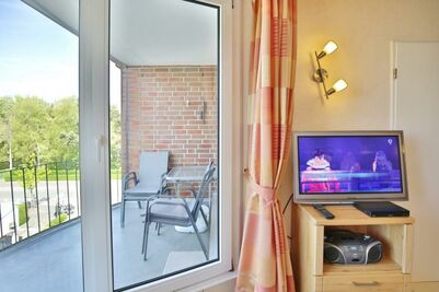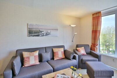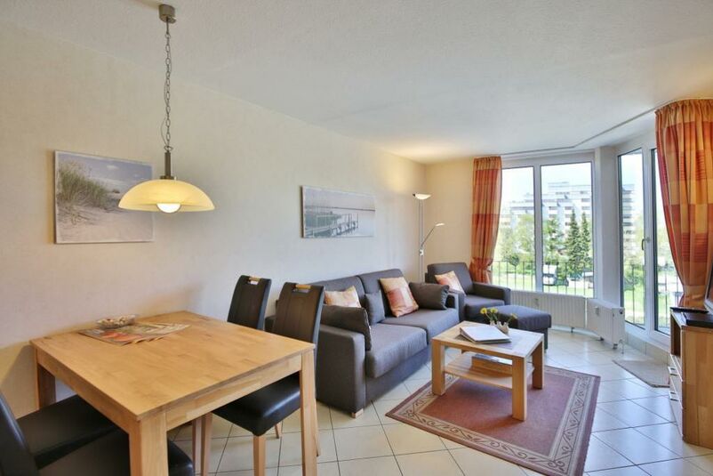 2-Raum-Wohnung auf ca. 40m², 3. Etage, komplett ausgestattet bis 4 Pers., 1 Schlafzimmer mit 2 Einzelbetten (0,90m x 2,00m), 1 kombiniertes Wohn/Schlafzimmer mit Schlafcouch, Sat-TV, kostenloses W-Lan, CD-Radio, Blue-Ray-Player, Küchenzeile mit 2 Pl.-Herd, Mikrowelle und Geschirrspüler, Dusche /WC (neu in 2020), Flur, Balkon (west), keine Haustiere, Tiefgarage #306.