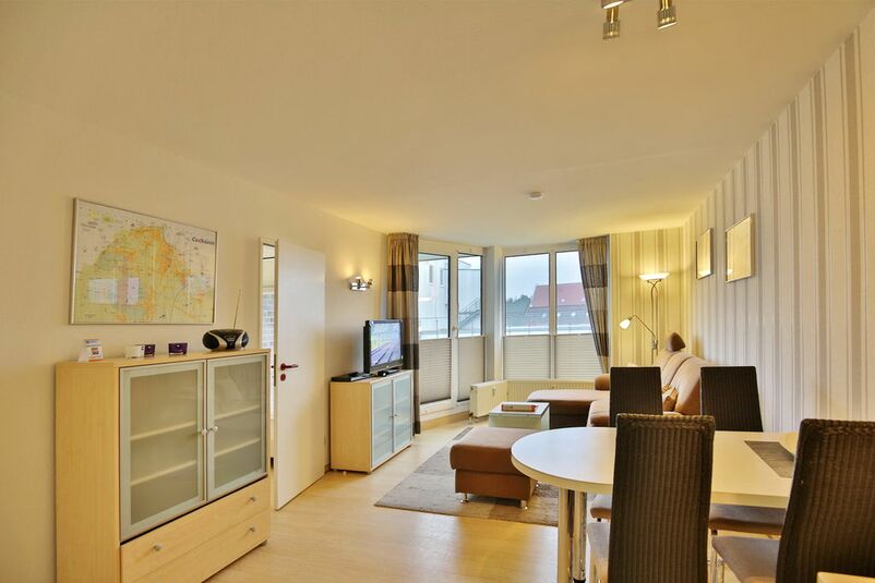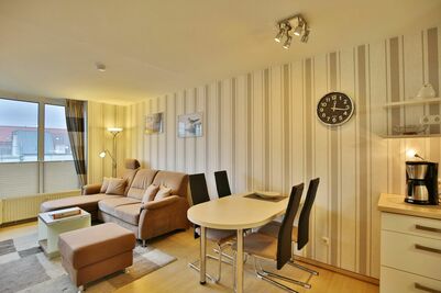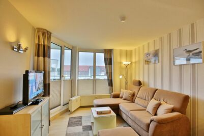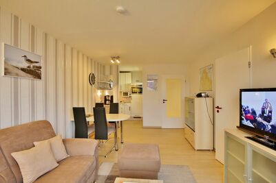 Schöne 2-Raum-Wohnung auf ca. 40m², 3. Etage, komplett ausgestattet bis 4 Pers., 1 Schlafzimmer mit 2 Einzelbetten, 1 kombiniertes Wohn/Schlafzimmer mit Eckschlafcouch, Sat-TV, kostenloses W-Lan, neue Einbauküche mit Mikrowelle, Backofen, Geschirrspüler. Dusche/WC, Flur, Balkon (ost, mit Balkonmöbeln & Sonnenschirm, saisonabhängig) mit Teilseesicht, keine Haustiere, Nichtraucher, Pkw-Stellplatz in der Tiefgarage #309.