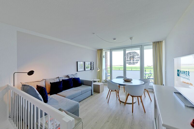 Schöne neu renovierte 2-Raum Wohnung über zwei Etagen auf ca. 60m². Das Schlafzimmer im EG mit Doppelbett Kabel-TV. Du/Wc. Im 1. OG befindet sich das Wohn-/Schlafzimmer mit Querschläfer, Kabel-TV, Bose-Soundlink. Küchenzeile mit Vollausstattung (Geschirrsp. Mikrow. etc.) Balkon zur Wasserseite mit dem einmaligen Blick auf die Elbmündung. Die Wohnung verfügt über Fußbodenheizung, kostenfreies W-Lan und ist allergikergerecht ausgestattet. Tiefgaragenstellplatz #2 (Durchfahrtshöhe 1,90m), Keine Haustiere erlaubt. Nichtraucher.