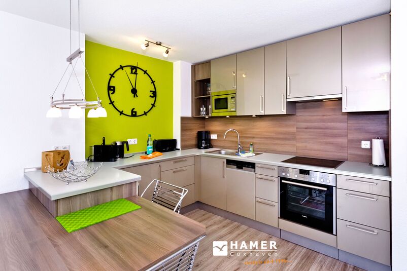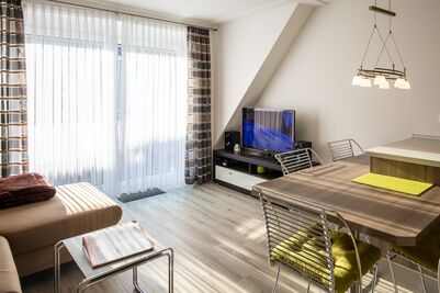 Sehr schöne 3-Raum-Maisonette-Wohnung (ca. 62m²), 2.Etage, 1 Schlafzimmer mit Doppelbetten - Rollläden, 1 Schlafzimmer im Dachgeschoss mit zwei Einzelbetten - Plissees, teilweise mit Insektenschutz, 1x Du/Wc mit Föhn, 1x Gäste-Wc, Wohnzimmer mit großer Küchenzeile (Back., Mikrowelle, Geschirrspüler) 2xSAT-TV, Stereo, kostenloses W-LAN-Internet, großer Balkon (süd) mit Markise, Rollläden, reservierter Pkw-Stellplatz #18, Nichtraucher und keine Haustiere gestattet.