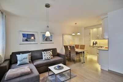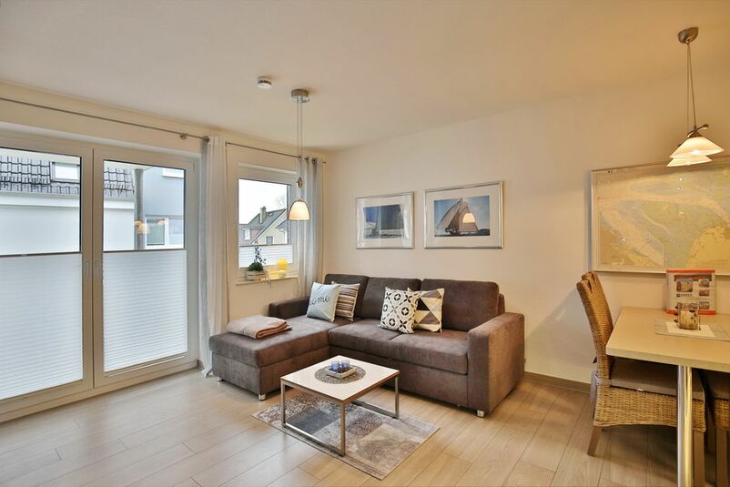 Schöne, vollständig ausgestattete Wohnung für 3 Pers., komplett mit hellen Bodenfliesen in Parkett-Optik, 1. Etage auf ca. 46 m², großer Süd-Balkon mit Balkonmöbeln und Sonnenschirm (saisonabhängig), 1 Schlafzi. mit Doppelbett, Wohn-/Schlafzi. mit Schlafcouch, teilweise mit Insektenschutz, 2x Sat-TV, W-LAN kostenlos., große Komfort-Küchenzeile (Geschirrspüler, Backofen, Mikrowelle, sep. Gefrierfach), Dusche mit bequemer Sitzfläche, Föhn, Kosmetikspiegel, Rollläden, breiter Pkw-Stellplatz #5, Nichtraucher, keine Haustiere
