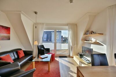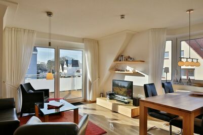 Sehr schöne, helle 3-Raum-Maisonette-Wohnung (58m²) bis 4 Pers., 2.Etage, 1 Schlafzimmer mit Doppelb., 1 Schlafzimmer im Dachgeschoss mit Einzelbetten, Du/Wc u. Gäste-Wc, teilweise mit Insektenschutz, Föhn, Wohnzimmer mit vollständiger Küchenzeile (Gefrierfach, Back., Mikrow., Geschirrspüler) 2xSAT-TV, Stereo, W-LAN kostenlos, großer Balkon (süd), Rollläden, Pkw-Stellplatz #9, keine Haustiere erlaubt, Nichtraucher.