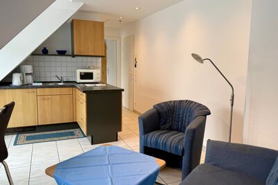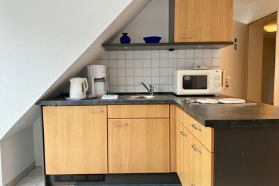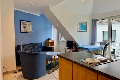 Neu ab 01.02.26 - Zentrales 2-Raum-Appartement auf der 1. Etage bestehend aus einem Wohnzimmer mit offener Küchenzeile und Zugang zum Ostbalkon. Einem Schlafzimmer mit 2. TV und einem hellen Tageslichtbad mit Dusche. Zur Wohnung gehört der PKW-Stellplatz #10 hinter dem Haus. Natürlich Nichtraucher und keine Haustiere.