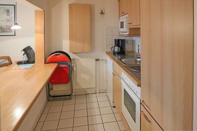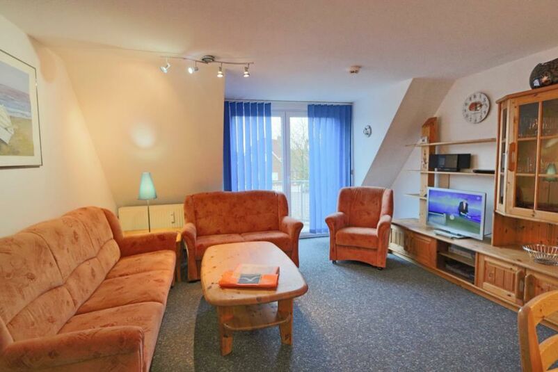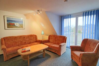 4-Raum-Maisonette-Wohnung über 2 Etagen mit ca. 70m², komplett ausgestattet bis 6 Pers., 1 Schlafzimmer mit 2 Einzelbetten, 1 Schlafzimmer mit Doppelbett, 1 kl. Schlafzimmer mit ausziehbarem Doppelbett, Treppe mit Kindersicherung, 1 Wohnzimmer mit Balkon (west), Kabel-TV mit DVD, Stereoanlage, Küchenzeile mit 4 Pl., Backofen, Mikrowelle, Spülmaschine, 2xDu/WC, Föhn, Internetflatrate kostenlos, Nichtraucher, keine Haustiere, 1 Pkw-Stellplatz #16 vor dem Haus, zur Wohnung gehört ein Strandkorb am Sandstrand (#96 Feld 20 vom 26.04. bis 15.10.)