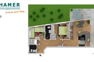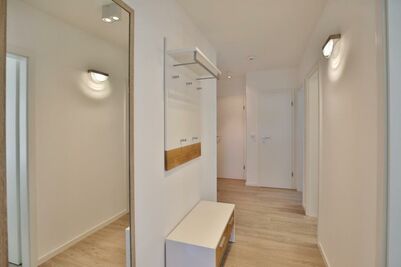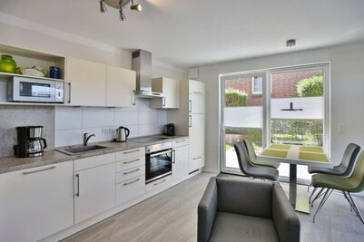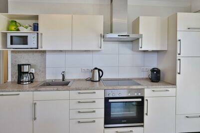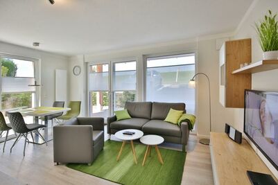 Sehr schöne und hochwertige 3-Raum-Ferienwohnung im EG gelegen mit schöner Sonnenterrasse, Wohnzimmer mit toll ausgestatteter Küchenzeile (Back, Mikrow., Geschirrsp., Gefrierfach, Tassimo-Maschine), 1 Schlafzimmer mit Doppelbetten, 1 Schlafzimmer mit 2 Einzelbetten, beide Schlafzimmer mit Einbaumöbeln, alle Räume mit elektr. Außenjalousien verdunkelbar und teilweise mit Insektenschutz, 2 x DU/WC mit Föhn, beide Bäder mit Fußbodenheizung, 3 x SAT-TV, DVD u. BlueRay, CD-Stereo, kostenfreies WLAN-Internet, große Terrasse (süd/west), keine Haustiere gestattet, Nichtraucherwohnung, reservierter und sehr breiter PKW-Stellplatz #1 am Haus.