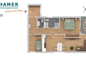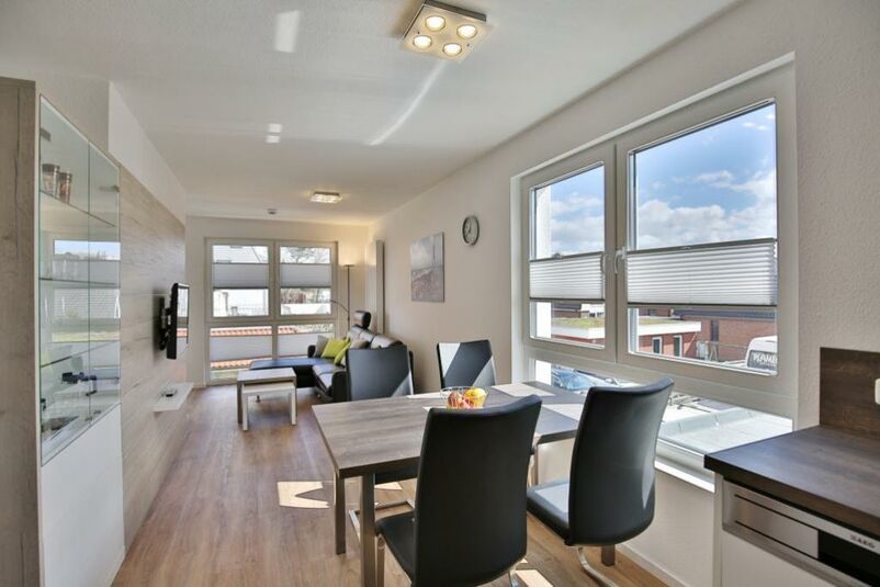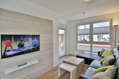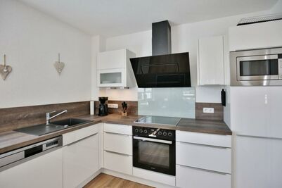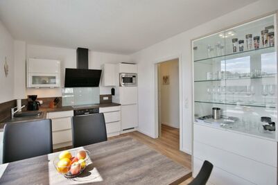Schöne 3-Raum-Wohnung mit Teilseesicht im 1.OG bis 4 Pers., Wohnzimmer mit vollständiger Küchenzeile (Induktion, Back, Mikrow., Geschirrsp.) 1 Schlafzimmer mit Doppelbetten und Rollläden, 1 Schlafzimmer mit 2 Einzelbetten und Rollläden, hochwertige Einbaumöbel, kostenloses W-LAN, 1xDU/WC mit Fussbodenheizung , 1xGäste-WC, 2 x Sat-HD-TV, Radio, Balkon (nord-ost) mit Teilseesicht, Personenaufzug, keine Haustiere gestattet, Nichtraucherwohnung, reservierter und breiter Pkw-Stellplatz #10 am Haus.